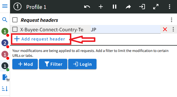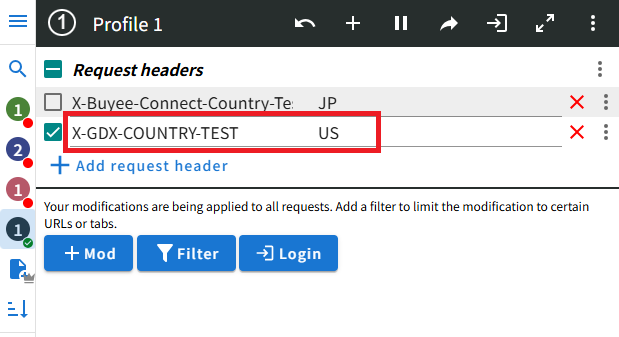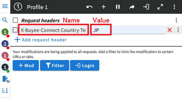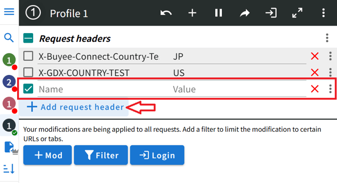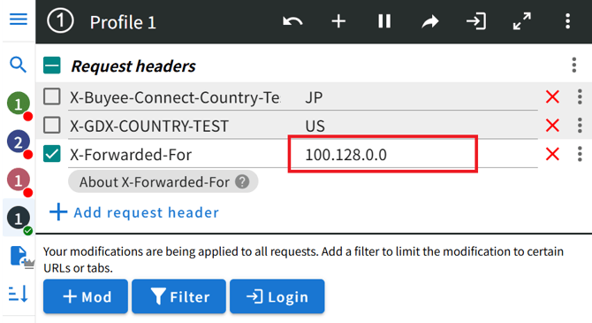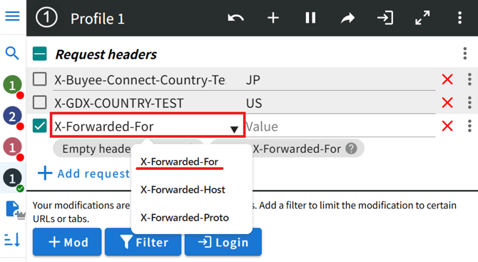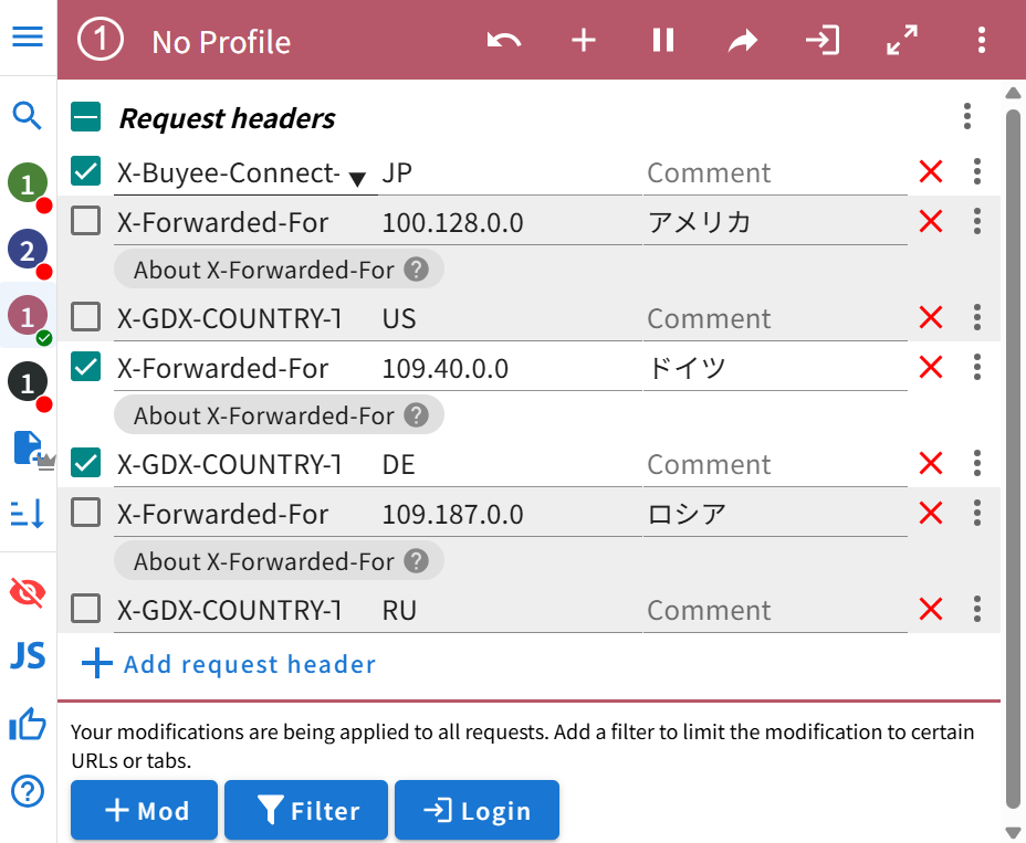 - 1つのProfileに複数の海外IPを設定しておくことも可能です。これまでと同様に Add request headerで入力欄を追加し、国コードとIPアドレスを設定してください。