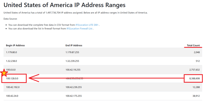 - Total Count の数ができるだけ大きいものを探し、Begin IP Address の値をコピー