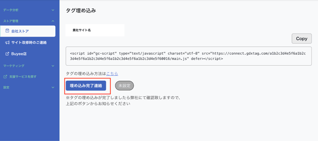 設置および確認が完了しましたら、Global Partner Portal内の「埋め込み完了連絡」ボタンを押下してください。弊社にて最終確認を行います。